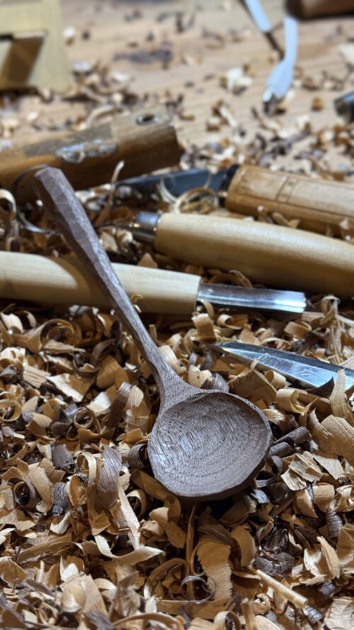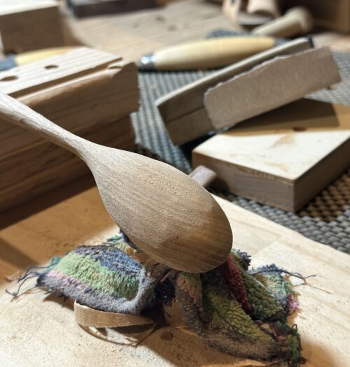 生木は、スプーン作りとの相性がとても良い素材です。特に匙(すくう部分)の内側を彫る工程では、力を入れすぎなくても形が出るため、刃物のコントロールに集中できます。
