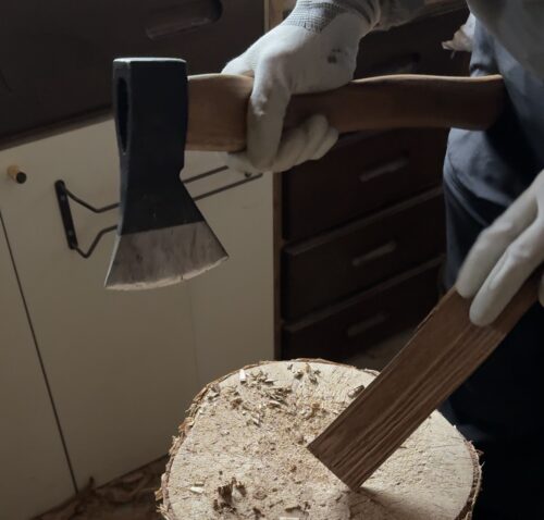 木のスプーン作りは、斧から始まります。丸太や角材からスプーンの原型となる材を切り出します。大事なことは2つ