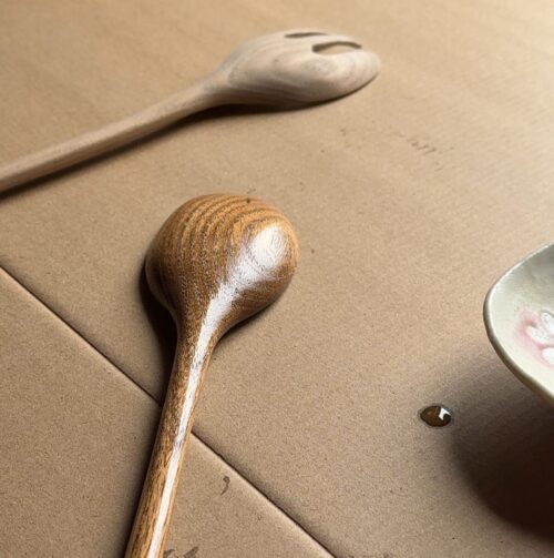 塗った直後は艶が出ますが、時間が経っても乾かず表面に油分が残りやすいため、木のスプーンなどの仕上げには向いていません。